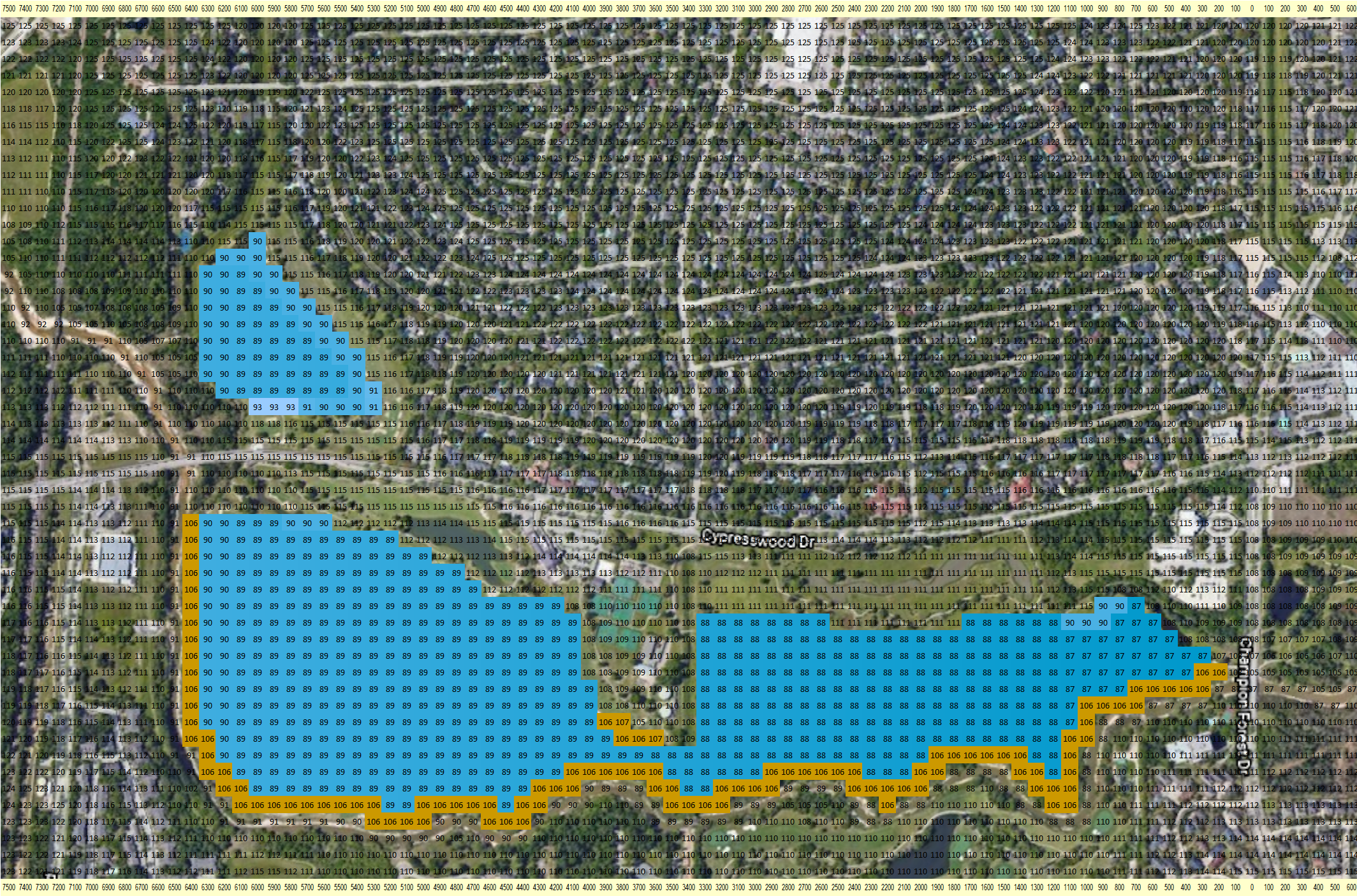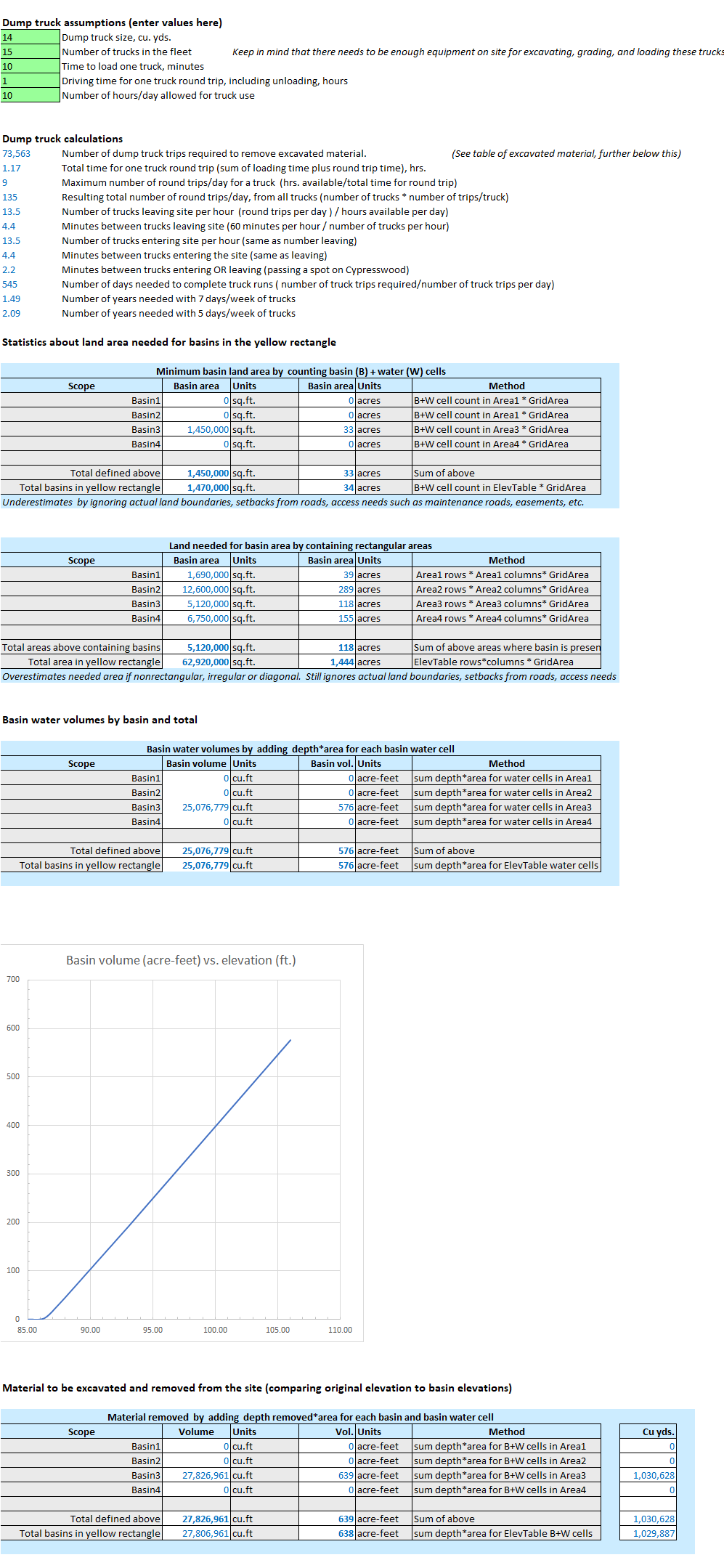 | TC Jester Stormwater Detention Basin | 525 in the west section? | 171.5 (total, east + west sections) 25 acres in the west section? | 185.9 for area west of TC Jester | 300,000 for area west of TC Jester | Planned 3 years for the area west of TC Jester  |    The “minimum area” for the cases analyzed here is based on the exact amount of land needed just for the water or immediate boundary area. It does not count any required access area, maintenance roads, channels, buffer area for the neighborhood, etc., or practical realities such as a desire for simple property boundaries.  So the actual area used by the County will likely be larger.  Perhaps some of the additional land required by the County could be addressed as easements on PUD property, rather than outright County ownership, although that might not be the preferred choice of HCFCD.  In this table, the area reported for existing HCFCD projects is the actual area reported by HCFCD.  The “years to excavate” is based solely on the time to excavate the dirt and rocks, hauling away material in trucks either 5 days/week or 7 days/week.  The assumptions are shown in the detailed spreadsheet images below, but the key ones are as follows:  trucks with a capacity of 14 cubic yards, 15 trucks in use, 10 minutes to load 1 truck, 1 hour time to drive and unload a truck, and 10 hours/day of truck usage.  These assumptions were held constant for comparison purposes.  In reality, for the smaller projects, fewer trucks would be used, so the excavation time would be longer.  The “years to excavate” is only a part of an overall basin project.  It does not include all the additional time required for the entire project for design and review, various levels of government review in areas such as environmental as well as flood control, budget review and approval cycles, budget changes during the project, contractor bidding and selection, and so on.  All that could easily add years, and usually does. Calculations for each case are based on topographic map data in a 100 foot grid superimposed on a satellite photoThe calculations all start with topographic map data, as elevations above sea level, in feet.  These elevations are entered into a grid of 100 x 100 foot squares.  The map images that follow show the elevations. Those images are snapshots of a spreadsheet, with the 100 foot grid superimposed on a background satellite image.  You can zoom in on the images to better read the elevations in feet, or other features. Elevations from topographic maps are entered in selected grid squares, and interpolated for the remaining grid squares.  (Minimal data is entered in many areas outside of the basins, since that does not affect the basin results). In the gridded maps that follow, areas of possible detention basins are marked with blue background.  There are constraints on where detention can be placed.  For instance, the county has agreed to set back any detention basin at least 300 feet from the road or houses. Also, HCFCD now has a general policy of not building berms for elevated water detention.  The maximum height for the detention basin is chosen to be roughly consistent with the terrain, although some dirt may need to be moved in some areas to achieve this. Areas where some fill may be needed are generally along Cypress Creek, and are indicated with a solid brown background.  Since the grid size is 100 feet, but the actual width of this barrier might be less than that, the amount of flood water stored may be somewhat greater than calculated here. The calculations for each case include the maximum volume of water stored and the volume of excavated material. The material to be excavated is not necessarily the same as the basin volume - it depends on the current elevations.  As an example, imagine that the boundaries for a basin have been chosen.  If there is a large hill inside those boundaries, just removing material in the hill down to the level of the boundary will not add any flood storage volume.  Based on the material excavated, we calculate the number of dump truck loads.  With additional assumptions (that are easily adjusted in a spreadsheet) we then calculate the number of years to complete the excavation, the number of trucks per hour, and so on. The depths for each grid square in the detention basin are calculated, as deep as possible consistent with constraints on the slope steepness and bottom depth.  HCFCD guidelines for detention basins require that the steepest slope must have at most 1 foot vertically for 3 horizontal feet.  In addition to erosion concerns and suitability for mowing, this is also partly for safety reasons:  making it easier for people to escape if they fall into water.  The calculations here assume a more gentle slope on average of 1 vertical foot per 4 feet horizontally.  This leaves room for horizontal “shelves” for trails, which is common in projects combining detention with recreation.  HCFCD says that their normal practice is the 1:4 slope.  The lowest elevation in the basin is also constrained to ensure drainage.  A pure detention basin is supposed to dry out after a flood.  So, the design assumes no depth lower than the normal level of Cypress Creek, plus some sloping above that level to ensure drainage.  The basin can be dug deeper than that, if we want to have permanent ponds below the drainage level.  Ponds will not help with flood control, but are generally considered more attractive.  So the calculations are only to show the minimum amount of dirt to be excavated.  To have ponds, we would need more truck loads of dirt removed. It turns out that for the 1:4 slope, with the 100 foot grid size, most of the basin grid cells are at the lowest depth consistent with drainage, rather than being constrained by the slope.  If the county assumed a 1:3 slope, that would account for some of their higher basin volume estimate.  Results Tables:  calculations on detained wa